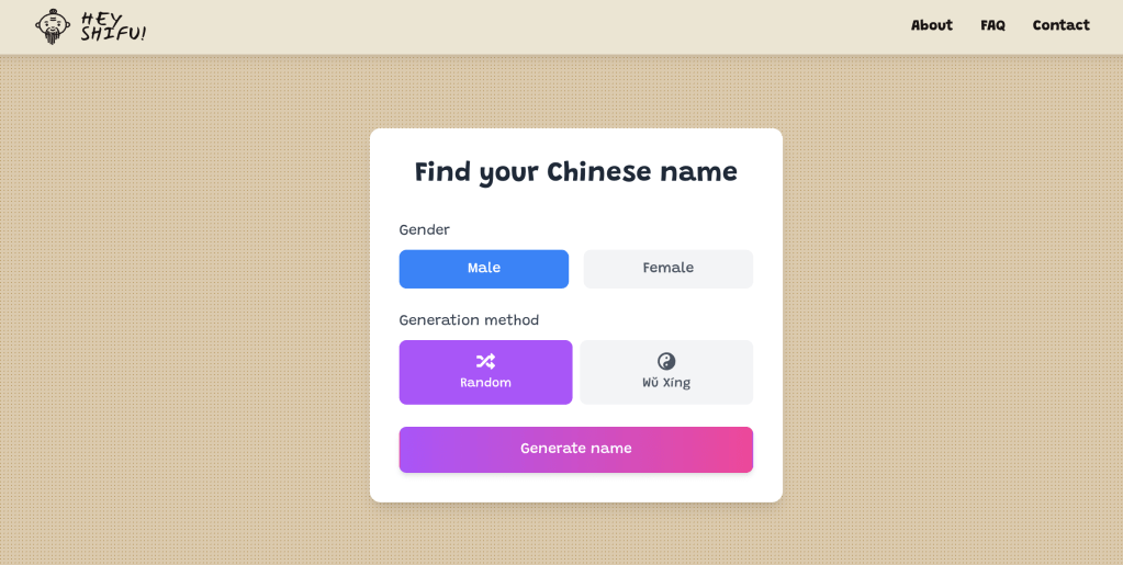 Hey Shifu is a fun and intelligent Chinese name generator that helps you discover a meaningful Chinese name tailored to your identity and preferences. Whether you’re learning Mandarin, exploring East Asian culture, or just curious about your name in Chinese, Hey Shifu makes it easy and insightful.
